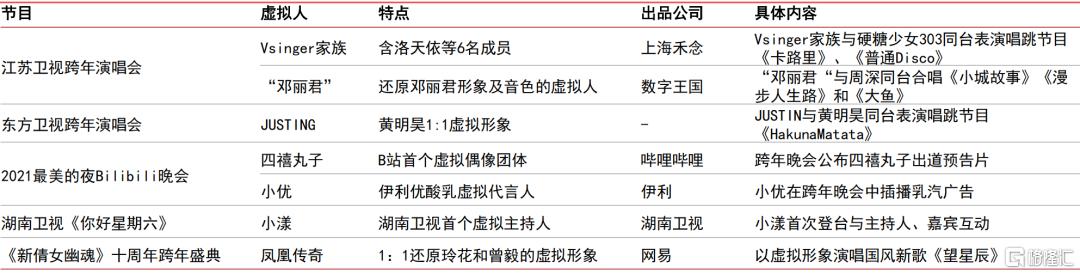多位虚拟人亮相主流跨年晚会:江苏卫视跨年演唱会上,国内顶尖虚拟偶像团体VSinger家族登台表演《卡路里》、《普通Disco》,还原邓丽君形象及音色的虚拟人“邓丽君”与周深同台演唱《小城故事》、《漫步人生路》和《大鱼》,东方卫视、哔哩哔哩等亦将虚拟人元素融入跨年晚会。