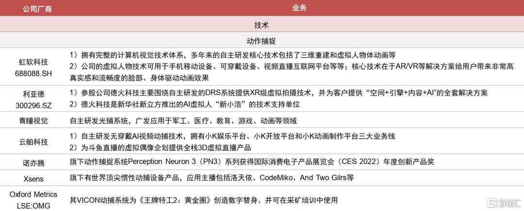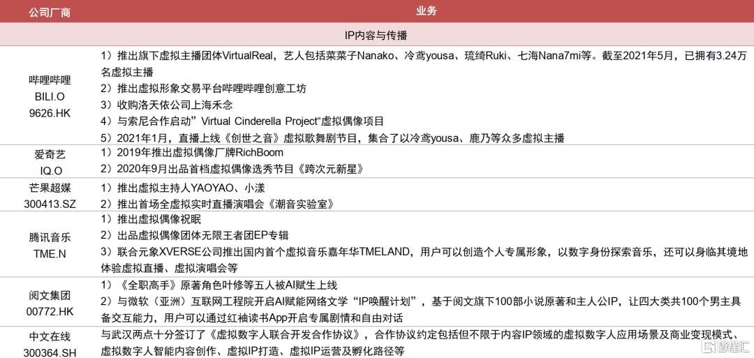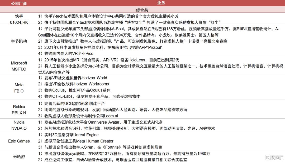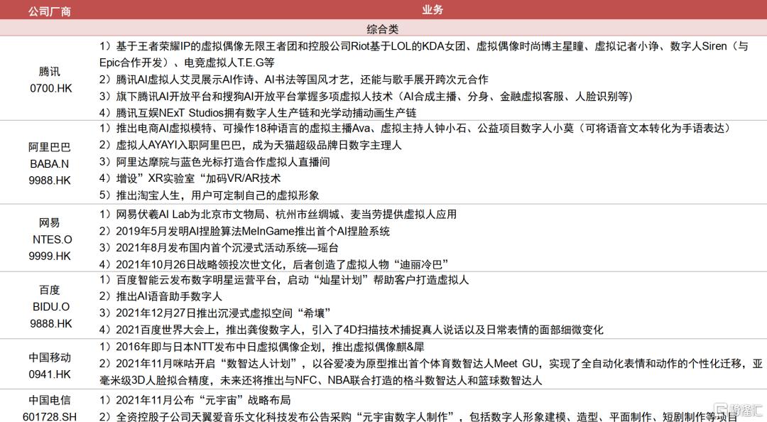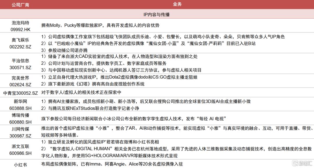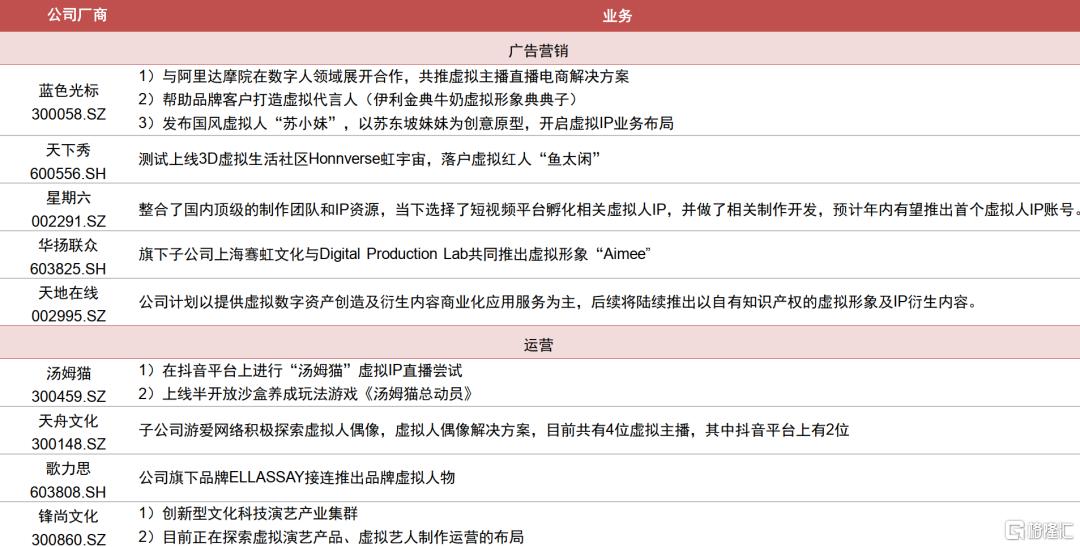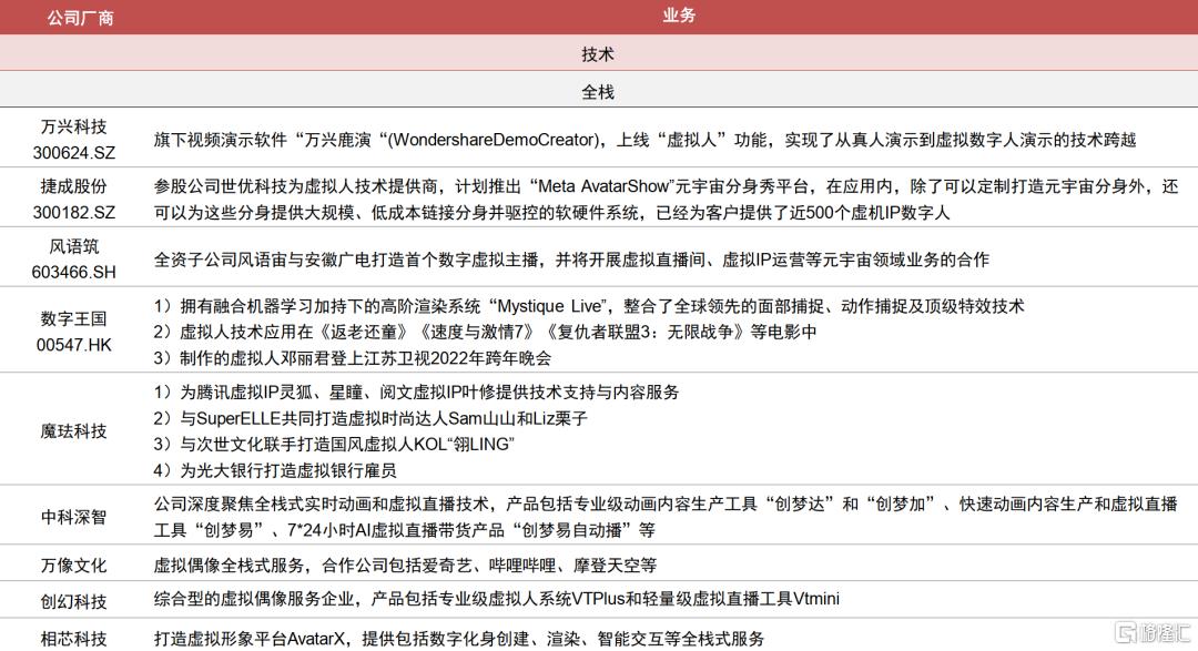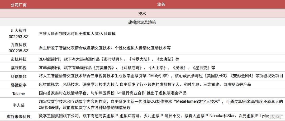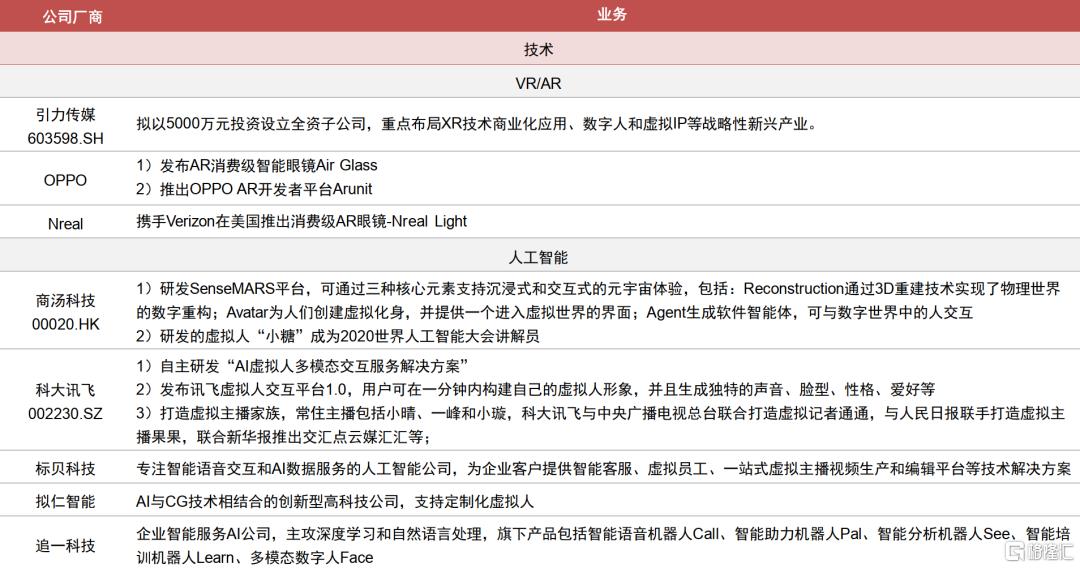 技术驱动产业链快速发展,内容升级丰富商业化变现路径。随着建模、驱动和渲染技术的演进,虚拟人的设计水平不断提升,应用范围日益扩大;同时短视频、直播等新模式的兴起也丰富了虚拟人的商业化变现路径。目前整个虚拟人产业分为上游基础层、中游平台层和下游应用层,我们也整理产业链的相关公司情况,可参见附表。