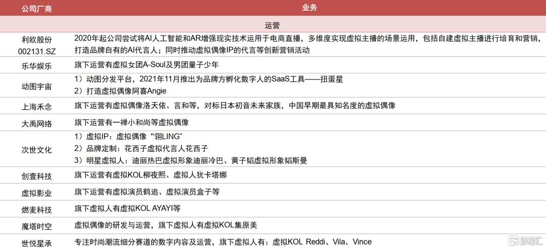 其壁垒主要体现在IP和运营能力。对于内容型虚拟人,核心在于其背后IP的价值,以“川沙妲己”玲娜贝儿为例,其本身形象就是通过皮套演员作为中之人进行运营的,基于其IP热度,若其形象打造为虚拟人预计能够实现迅速破圈爆红;同时结合IP衍生能力,放大虚拟人IP的变现空间。对于形象型虚拟人,也需要强大的运营能力,因为在技术加持下,做到高拟真度和出众的虚拟人形象目前已经不难,但是能够从众多形象型虚拟人中脱颖而出,其壁垒在于打造人设和运营的能力。以打造AYAYI的燃麦科技为例,其创始团队中有真人KOL运营经验,并为AYAYI打造了潮流品牌主理人和数字潮流艺术展策展人的人设和形象,后续也通过内容发布(小红书、抖音)、品牌联名(天猫超级品牌数字主理人等)、推出数字商品(联合美瞳品牌Moody打造“星空花语”限量数字藏品等)等方式进行运营,未来预计也将打造基于音乐、古风、电竞等人设的虚拟人矩阵。