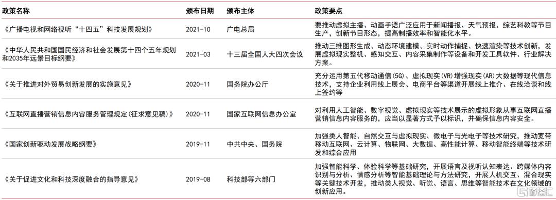 国家政策扶持文化与科技产业深度融合,鼓励虚拟人创新发展。科技和文化的协同发展,一直是国家重点关注的方向之一,要求推动智能技术在文化领域的创新应用,特别是2021年10月广电总局发布的《广播电视和网络视听“十四五”科技发展规划》中指出:“要推动虚拟主播、动画手语广泛应用于新闻播报、天气预报、综艺科教等节目生产,创新节目形态,提高制播效率和智能化水平”,首次明确地鼓励和支持虚拟人的发展。