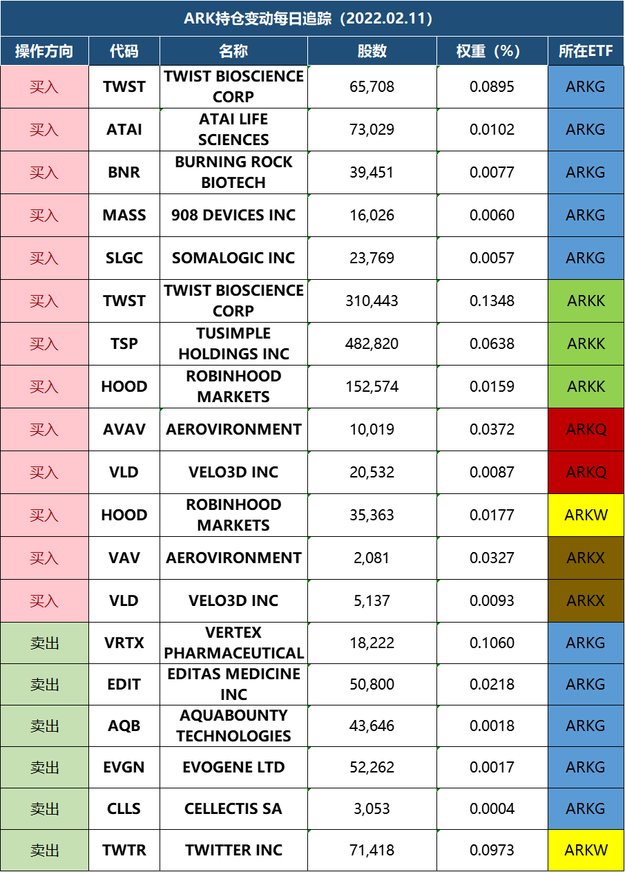 【Ark旗下基金持仓变化小结,2022年02月11日】
