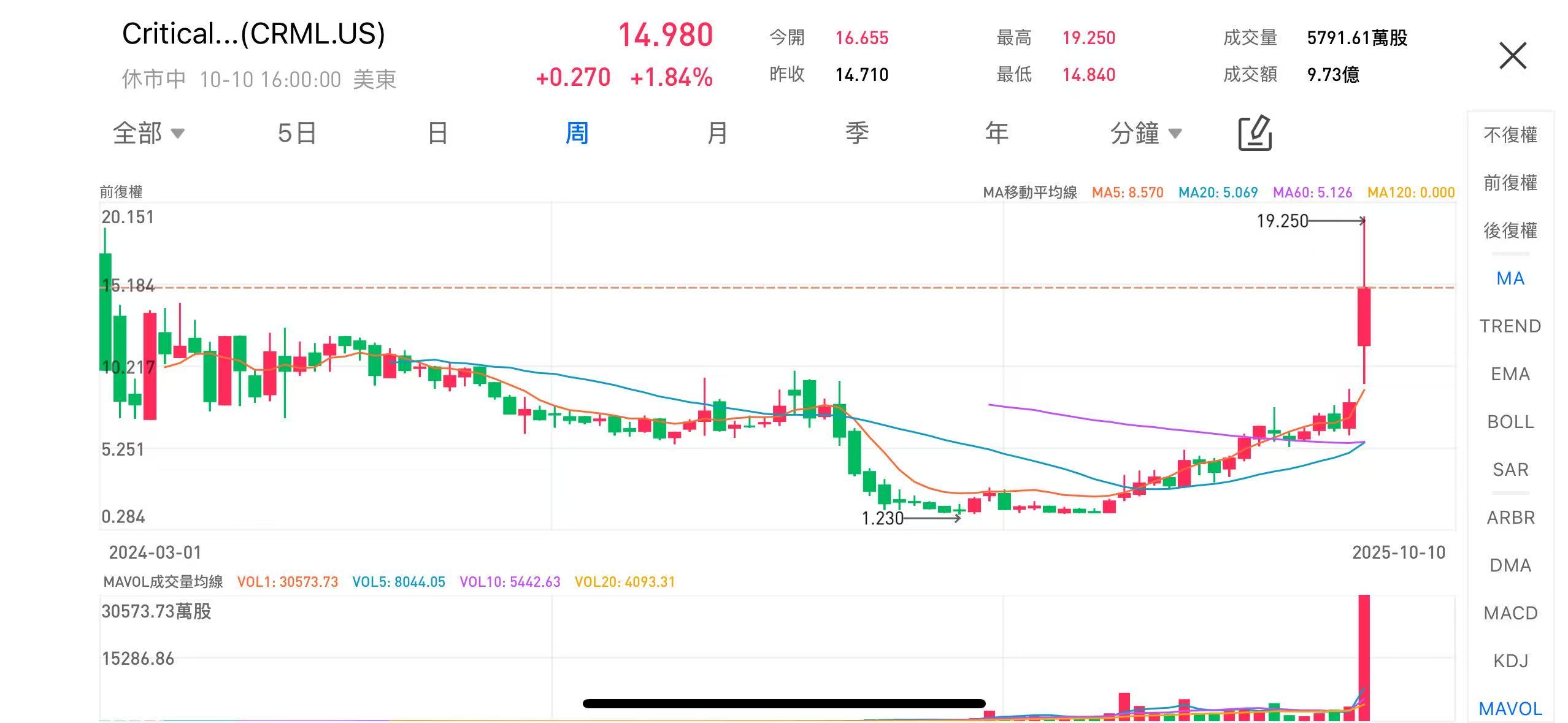 2025年10月10日,美股稀土概念股迎来强劲反弹,成为本周市场焦点。根据行情数据显示,Critical Metals Corp(CRML.US) 本周股价飙升至 最高19.25美元,周涨幅一度超过 500%,成交量放大至 5.79亿股。从技术面来看,该股自年初低位约 1.23美元 起已实现逾 10倍涨幅,成为2025年美股中稀土板块的领涨标杆。