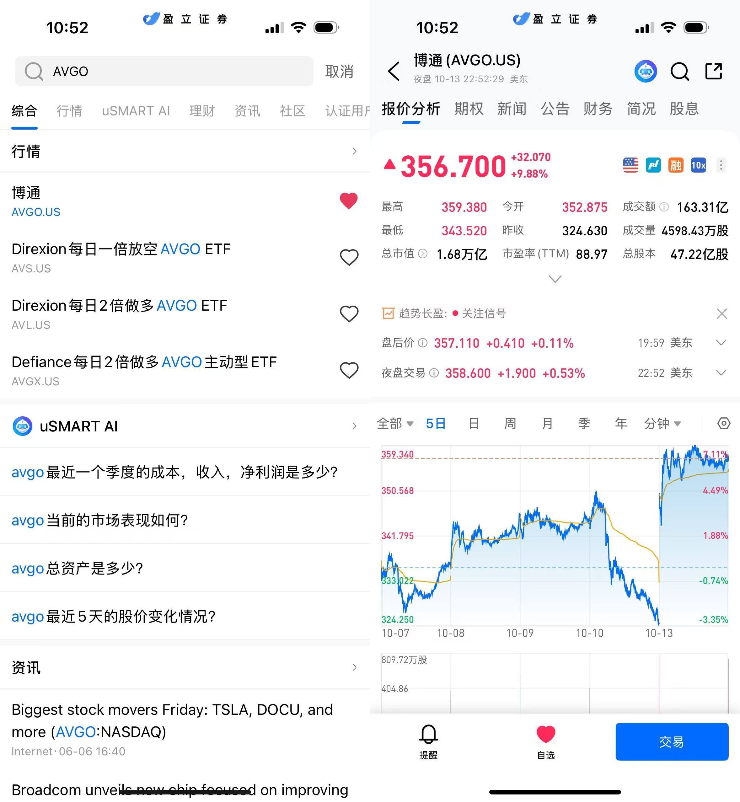 登入 uSMART HK APP 后,于页面最右上方点击「搜索」,输入标的代码(AVGO.US)并进入详情页,了解交易详情与历史走势。点击右下角「交易」,选择交易类型,最后填写交易条件后送出订单即可。