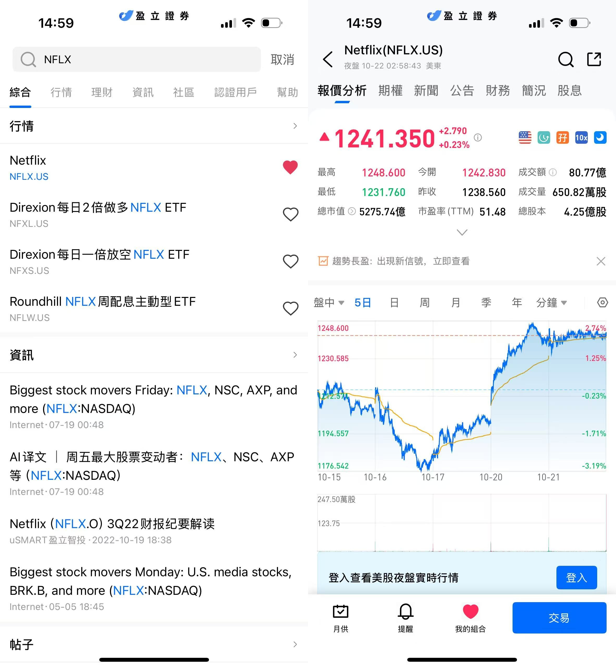 登入 uSMART HK APP 后,于页面最右上方点击「搜索」,输入标的代码(NFLX.US)并进入详情页,了解交易详情与历史走势。点击右下角「交易」,选择交易类型,最后填写交易条件后送出订单即可。