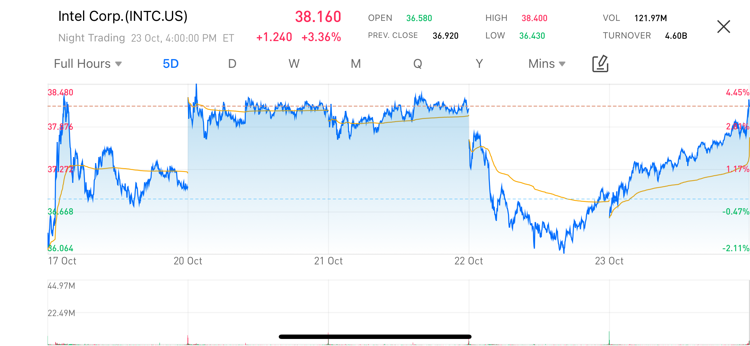 根据股价走势图,英特尔股价在10月17日至10月23日之间的波动情况可以明显看到,股价在发布财报后的大幅上升,突破了前期的阻力水平。