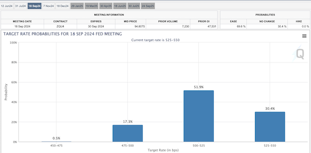 根据芝商所 FedWatch 工具,Fed 在 9 月降息 1 码的机率为 51.9%、降息两码 (50 个基点) 的机率为 17.3%、降息三码 (75 个基点) 的机率为 0.5%,而维持利率不变的机率为 30.4%。另外,Fed 在 11 月降息的机率高达 82.3%。