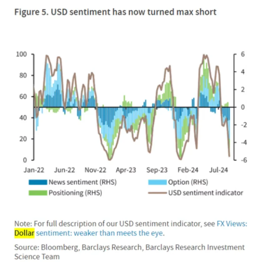 但实际的情况更为复杂,美联储可能线性降息,美元贬值很可能是非线性的。Stephen Jen认为,越来越多的美元储户开始抛售美元,他们对美元作为世界事实上的储备货币的地位产生了怀疑,并对美国不断上升的贸易和预算赤字感到紧张。巴克莱的报告也支持了这一观点,美元已经经历了自去年11月以来最严重的月度贬值,美元情绪最近已经从“极度看多”转为“极度看空”。