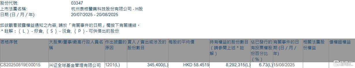 格隆汇8月20日丨根据联交所最新权益披露资料显示,2025年8月15日,泰格医药(03347.HK)遭兴证全球基金管理有限公司在场内以每股均价58.4519港元减持34.54万股,涉资约2018.93万港元。