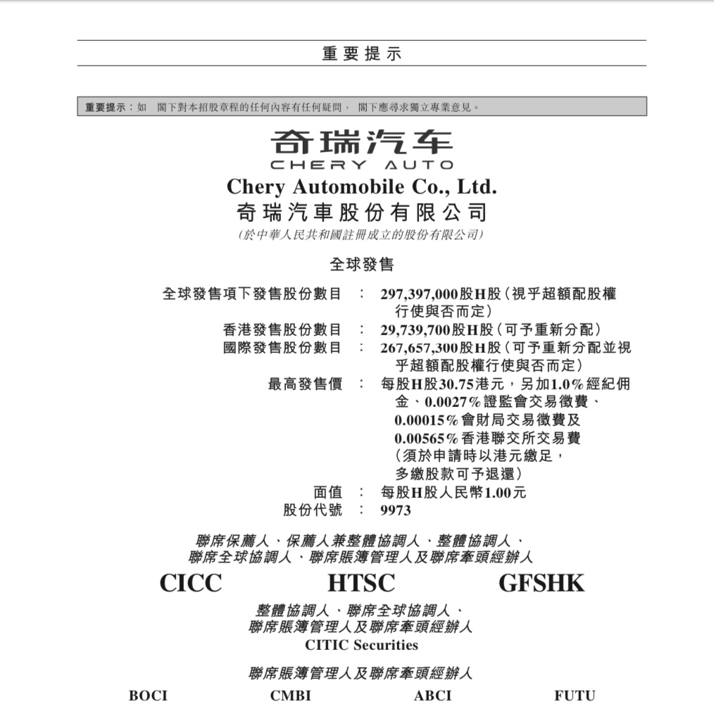 奇瑞汽车股份有限公司(CHERY AUTOMOBILE CO., LTD., 09973.HK)启动香港IPO,招股期为9月17日至9月22日,拟全球发售约297,397,000股H股,并设15%超额配股权;每股发售价介乎27.75—30.75港元,每手100股,入场费约3,106.00港元;预期9月25日于联交所主板挂牌,中金公司(CICC)、中信证券及海通国际等为联席保荐人。