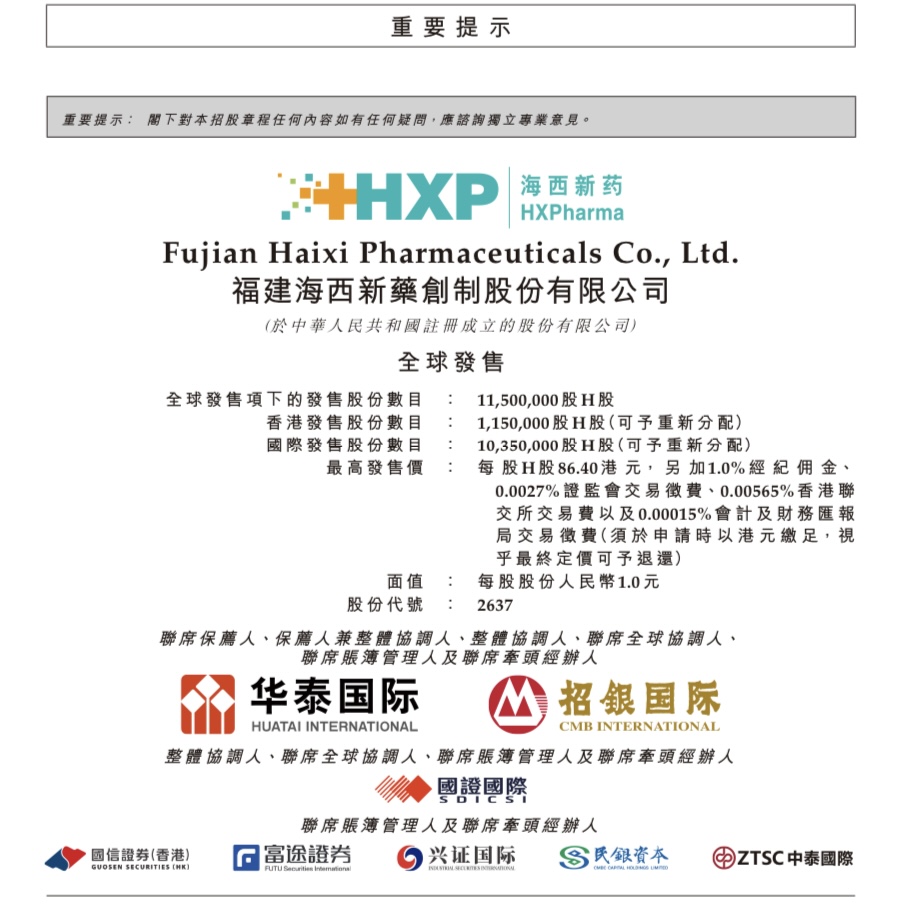 海西新药制药有限公司(Fujian Haixi Pharmaceuticals Co., Ltd., 02637.HK)启动香港IPO,招股期为10月9日至10月14日,拟全球发售约11,500,000股,其中香港发售股份约1,150,000股,国际发售股份约10,350,000股。每股发售价介乎69.88至86.40港元,每手50股,入场费约4,363.57港元。预期10月17日于联交所主板挂牌,华泰金融控股(香港)有限公司及招银国际融资有限公司为联席保荐人。