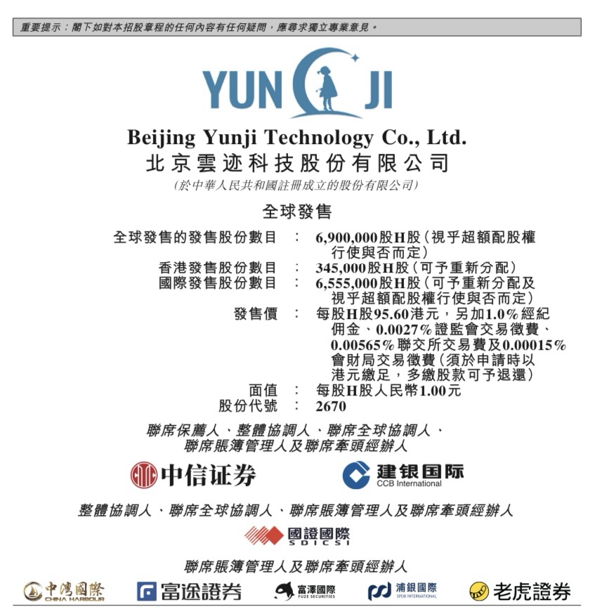 北京云迹科技股份有限公司(Beijing Yunji Technology Co., Ltd., 2670.HK)正式启动香港IPO。招股期为2025年10月8日至10月13日,拟全球发售约6,900,000股H股,其中香港公开发售约345,000股,国际发售约6,555,000股,并设有15%超额配股权。每股发售价为95.60港元,每手50股,入场费约4,828.21港元;预计10月16日于联交所主板挂牌上市。