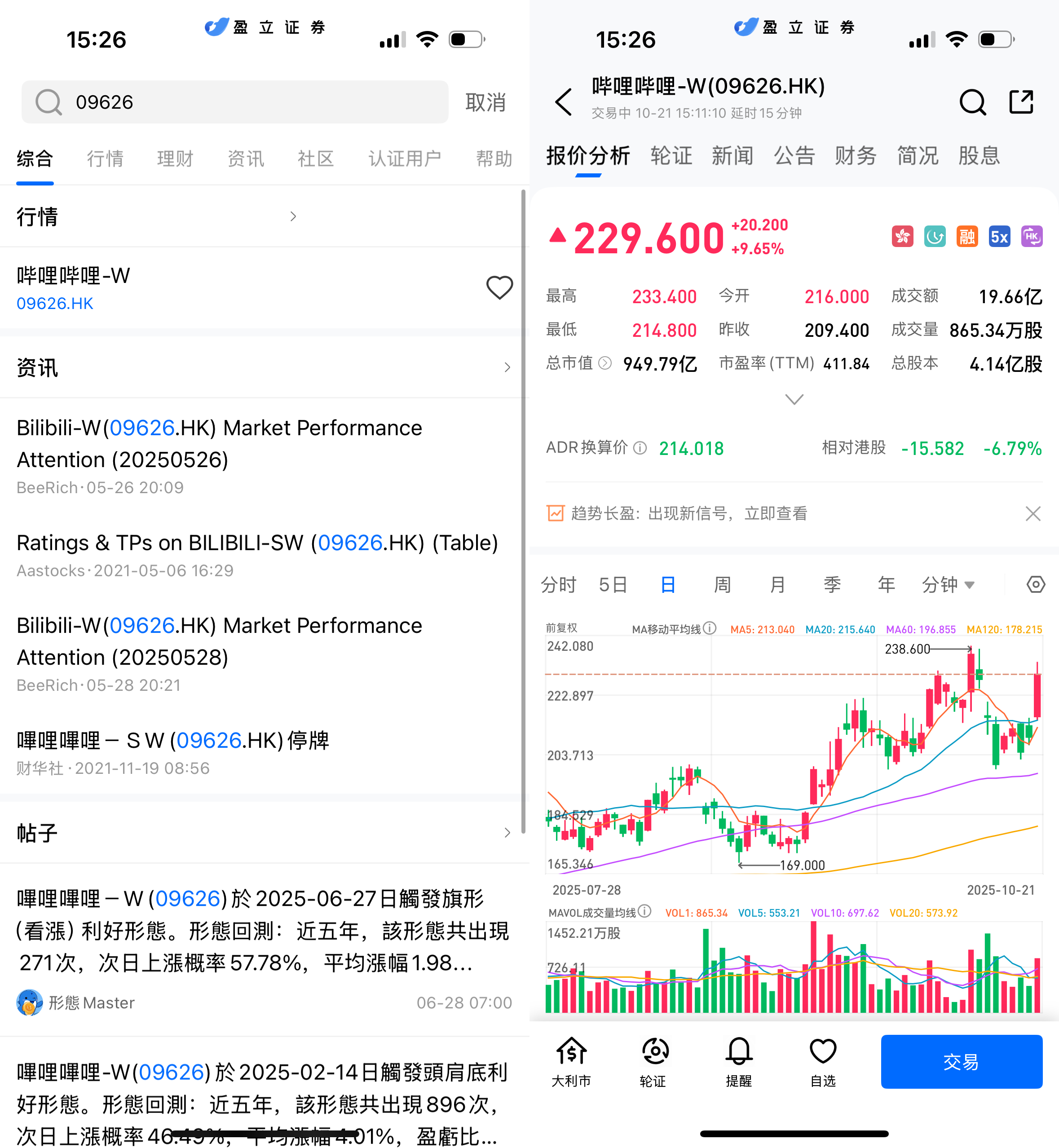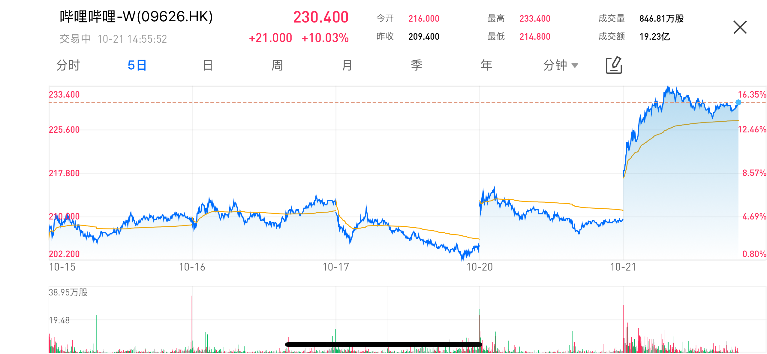 2025年10月21日 —— 哔哩哔哩(Bilibili,09626.HK)今日股价表现抢眼,收盘时报230.40港元,较昨日上涨21港元,涨幅达10.03%。过去五天内,股价震荡上行,尤其是在10月19日至21日间突破了220港元的关键阻力位,成交量显著增加,达到了846.81万股,成交额为19.23亿港元。