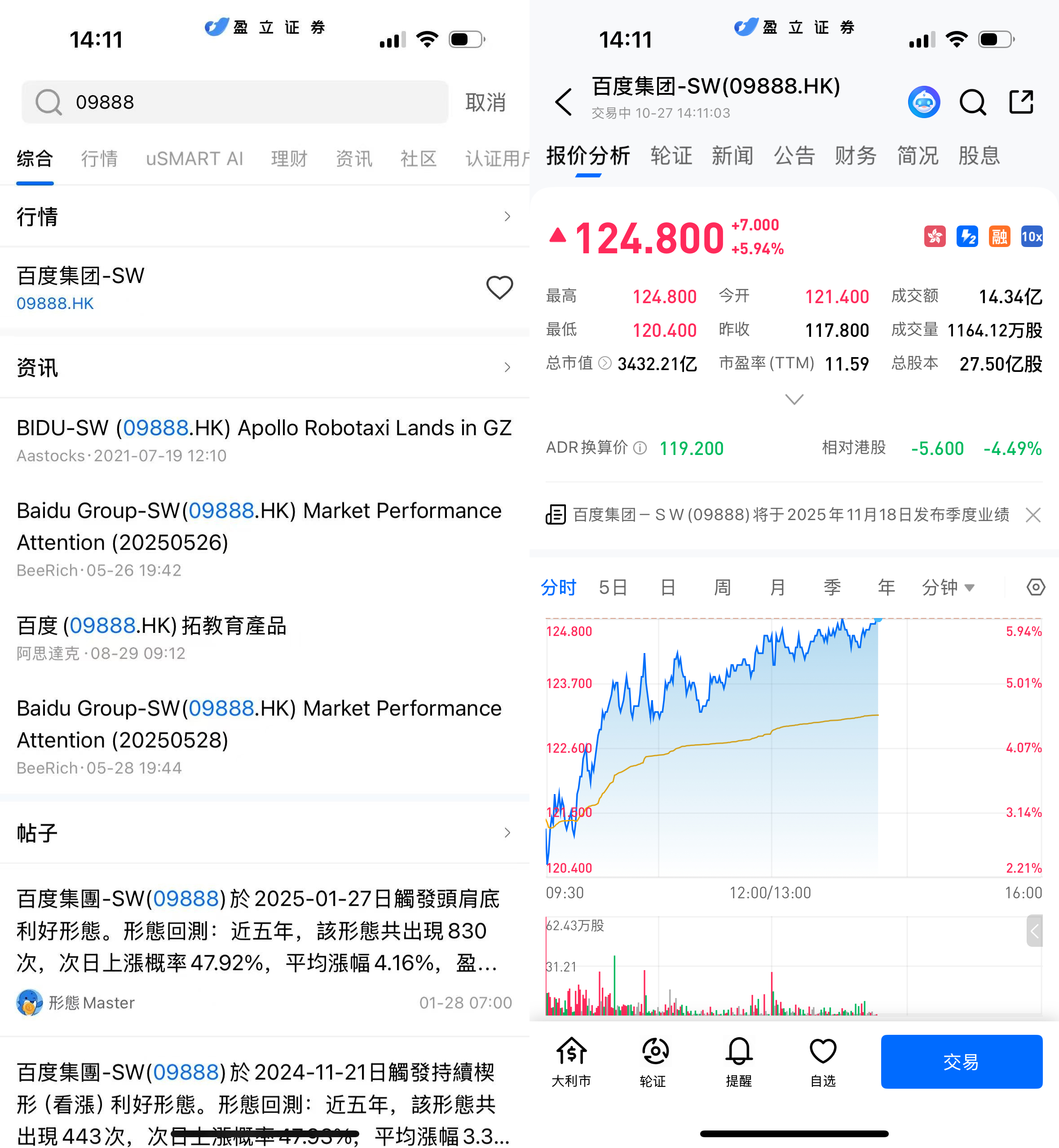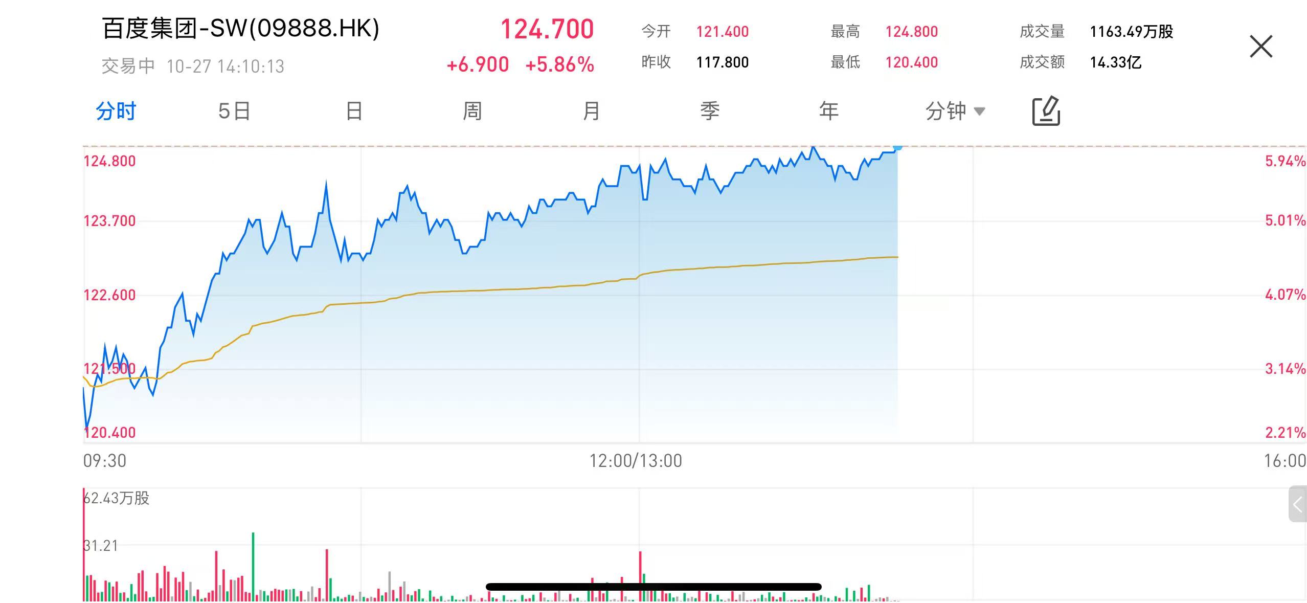 10月27日港股盘中,百度集团-SW(09888.HK)表现亮眼。截至14:10,股价报124.70港元,上涨6.90港元,升幅5.86%,盘中高见124.80港元,成交额明显放大,显示市场资金持续回流科技板块,对百度情绪转暖。