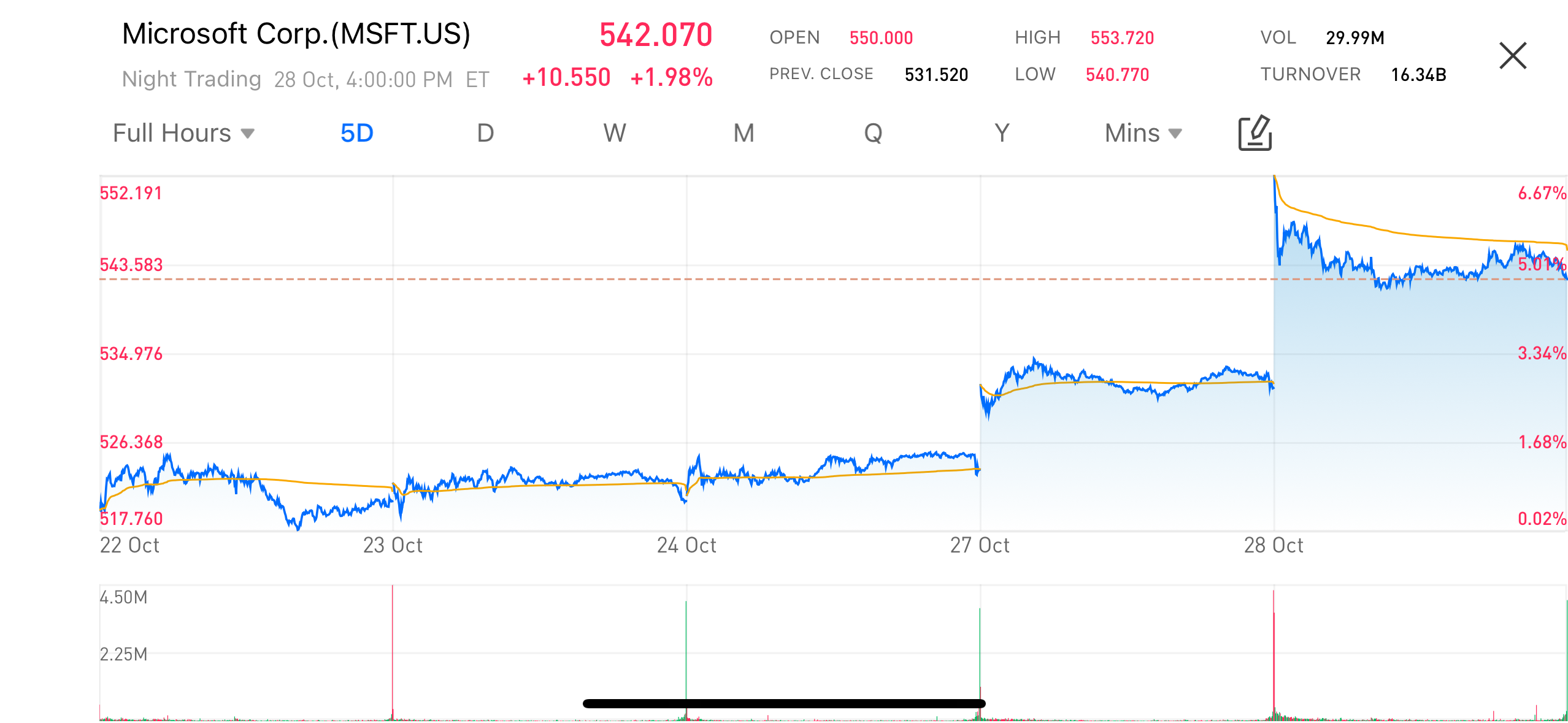 2025年10月28日 —— 微软(MSFT.US)股价上涨约2%,收盘报542.07美元,创下近期新高。 在近日公布的2025财年第三季度业绩表现稳健,营收同比增长13%至684亿美元,其中智能云业务收入同比上升19%,带动整体利润持续攀升。受业绩与AI业务双重利好推动,微软市值重新突破4万亿美元大关,巩固了其在全球科技领域中的龙头地位。