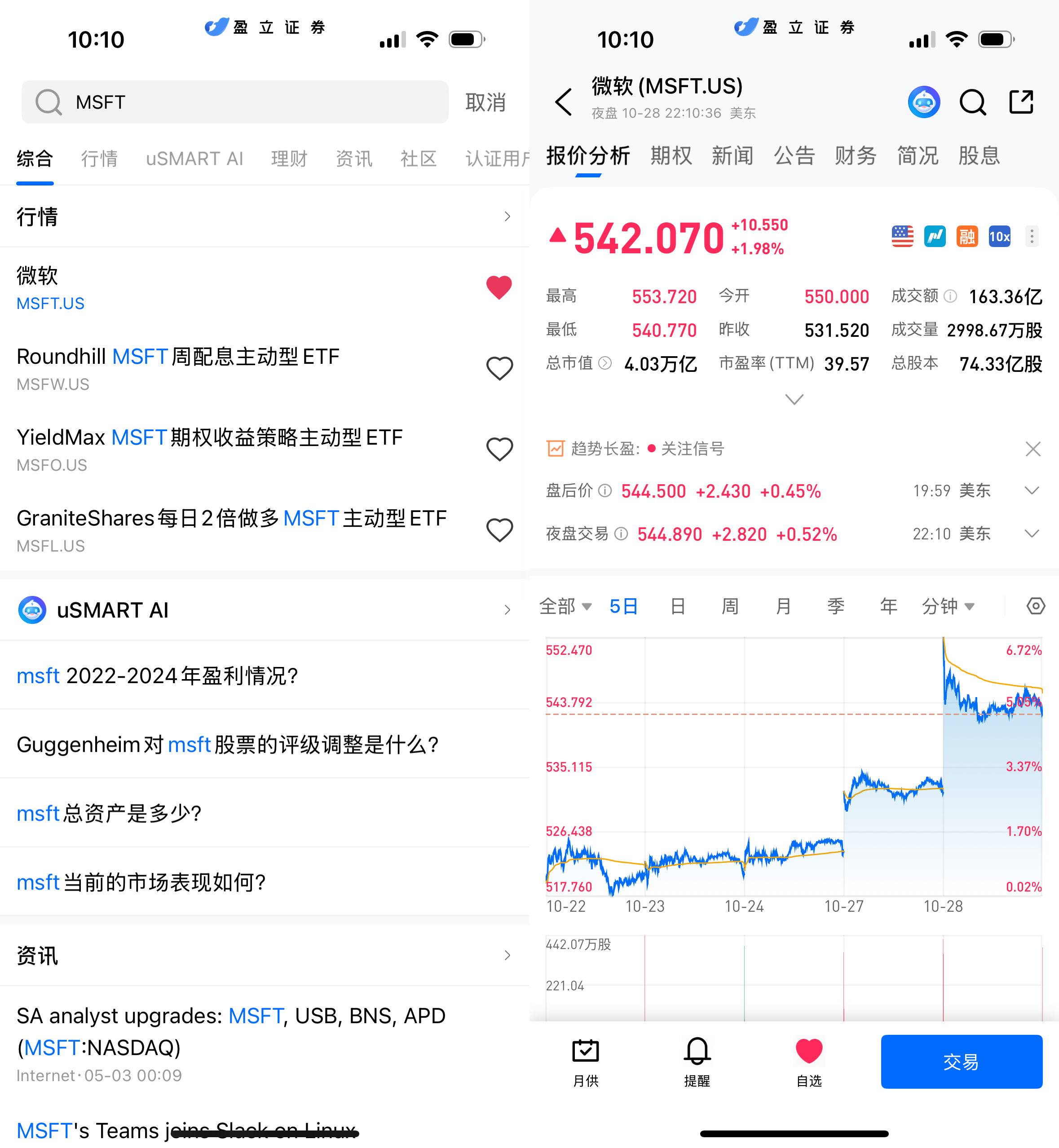 登入 uSMART HK APP 后,于页面最右上方点击「搜索」,输入标的代码(MSFT.US)并进入详情页,了解交易详情与历史走势。点击右下角「交易」,选择交易类型,最后填写交易条件后送出订单即可。