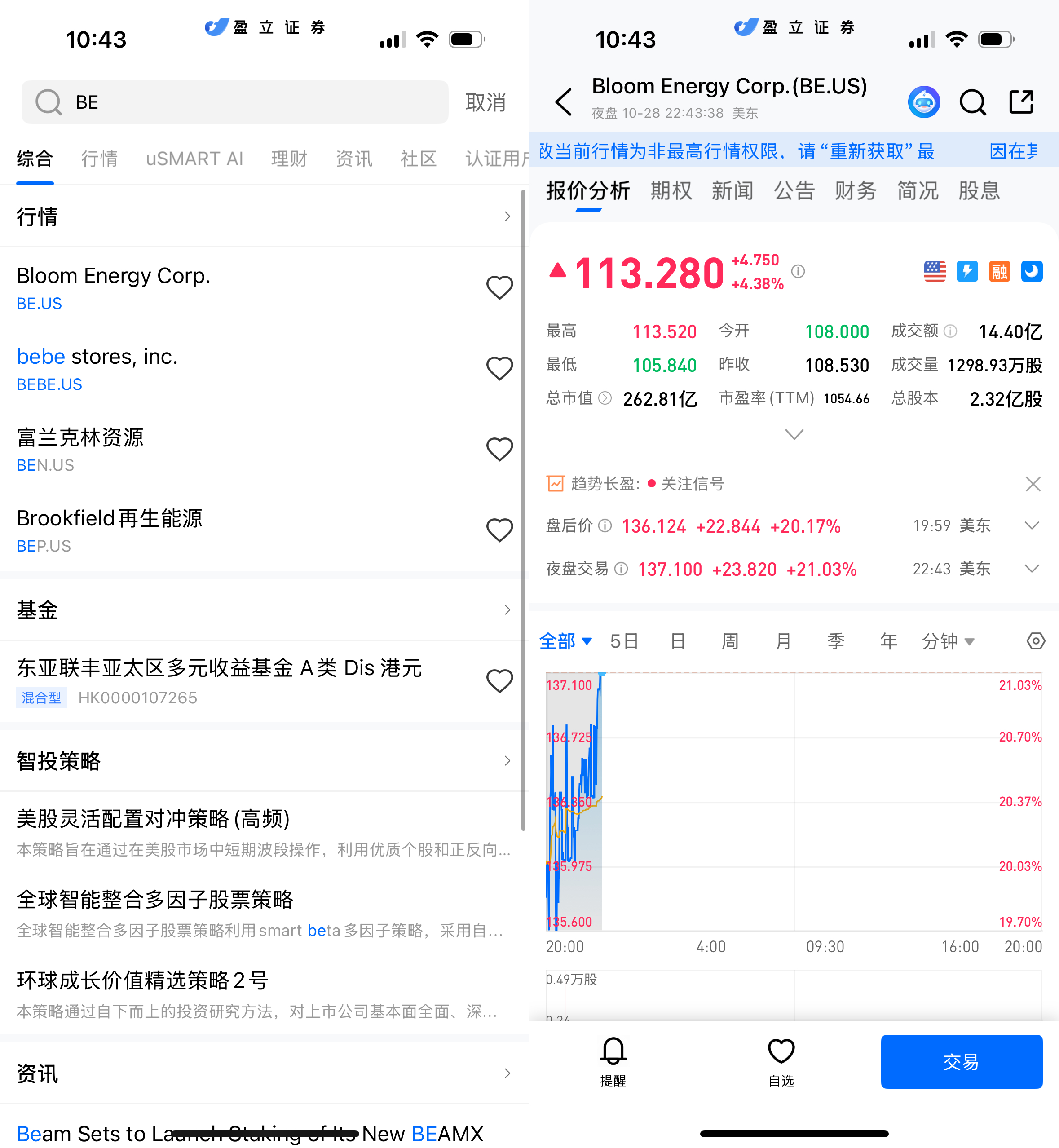 登入 uSMART HK APP 后,于页面最右上方点击「搜索」,输入标的代码(BE.US)并进入详情页,了解交易详情与历史走势。点击右下角「交易」,选择交易类型,最后填写交易条件后送出订单即可。