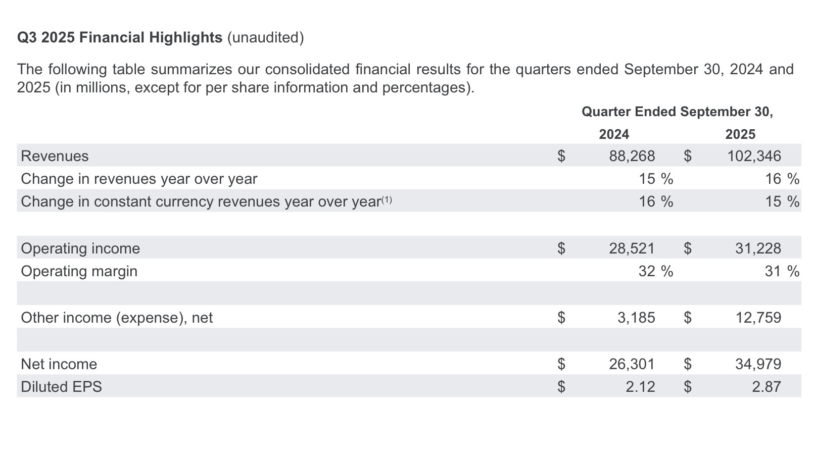 2025年10月29日,谷歌母公司Alphabet(GOOG.US)公布了其2025年第三季度的财报,数据显示公司各项业务表现亮眼,尤其是在云计算和广告业务上的强劲增长,推动公司整体业绩创下新高。财报发布后,Alphabet股价在盘后交易中大幅上涨,涨幅达到2.51%,报收275.17美元。
