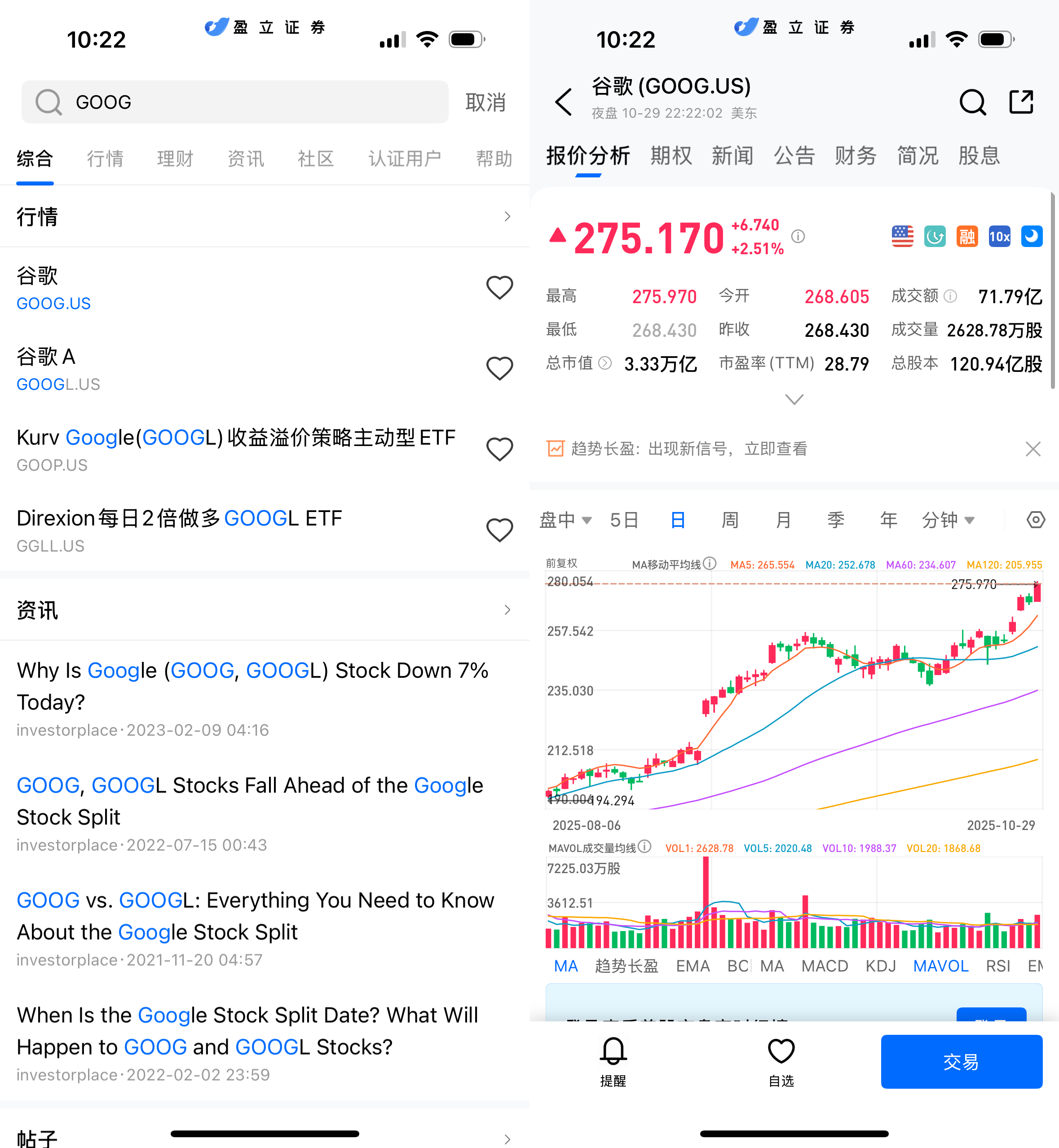 登入 uSMART HK APP 后,于页面最右上方点击「搜索」,输入标的代码(GOOG.US)并进入详情页,了解交易详情与历史走势。点击右下角「交易」,选择交易类型,最后填写交易条件后送出订单即可。