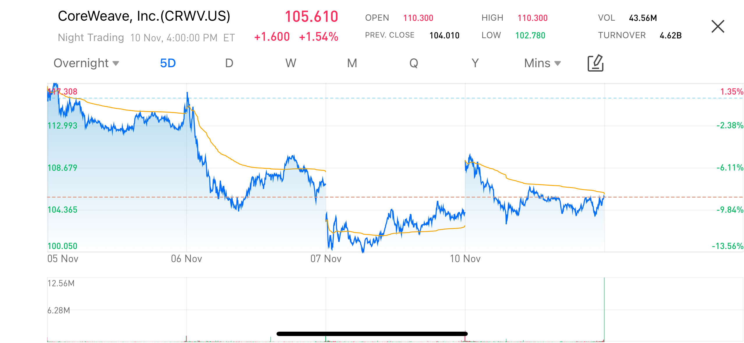 2025年11月10日——美国云计算与AI基础设施服务商 CoreWeave(CRWV.US)近期股价表现疲弱。根据最新行情数据显示,截至美东时间11月10日收盘,CoreWeave报105.61美元,单日微涨1.54%,但与11月初的高点117.30美元相比,仍累计下跌近10%。