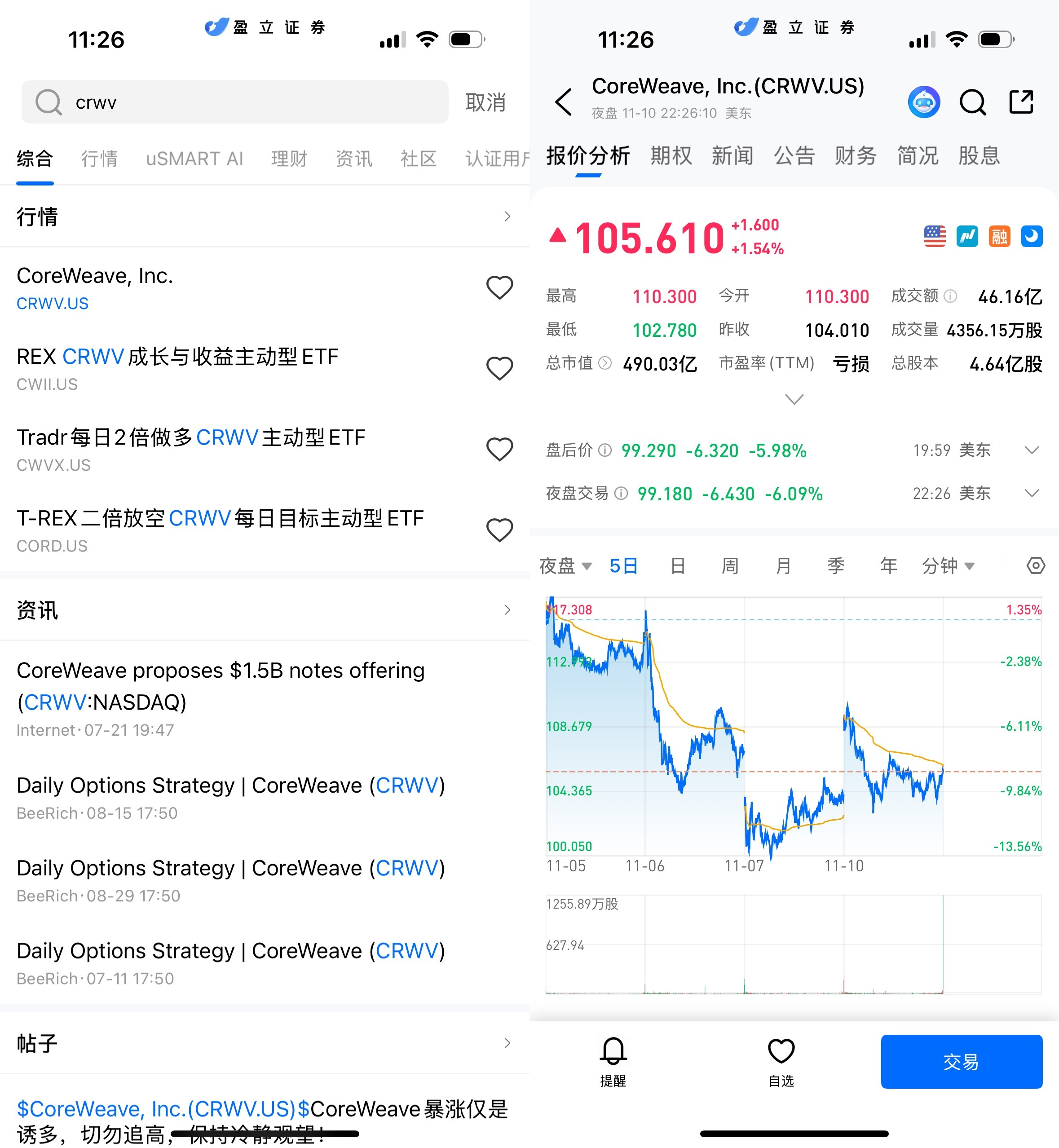 登入 uSMART HK APP 后,于页面最右上方点击「搜索」,输入标的代码(CRWV.US)并进入详情页,了解交易详情与历史走势。点击右下角「交易」,选择交易类型,最后填写交易条件后送出订单即可。