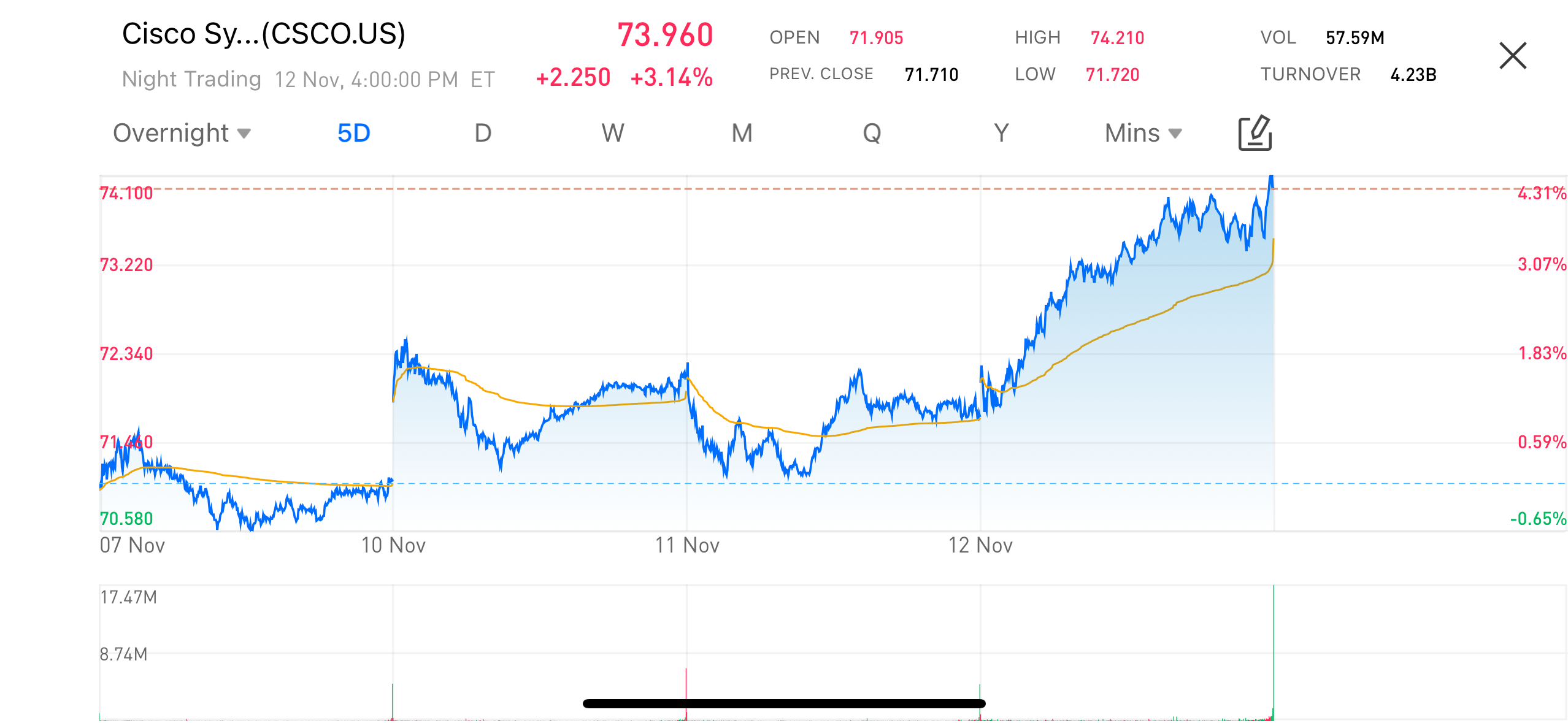 美国时间11月12日,思科系统公司(Cisco Systems, Inc., CSCO.US)股价在美股市场表现强劲,收盘报73.96美元,单日上涨2.25美元,涨幅达3.14%。过去五个交易日内,该股累计上涨逾4%,从约70.5美元一路攀升至接近74美元的阶段高点。当日成交量达到5759万股,成交额约42.3亿美元,市场买盘活跃。本轮上行主要受公司新季度业绩超出预期,以及AI相关业务增长加速的推动。