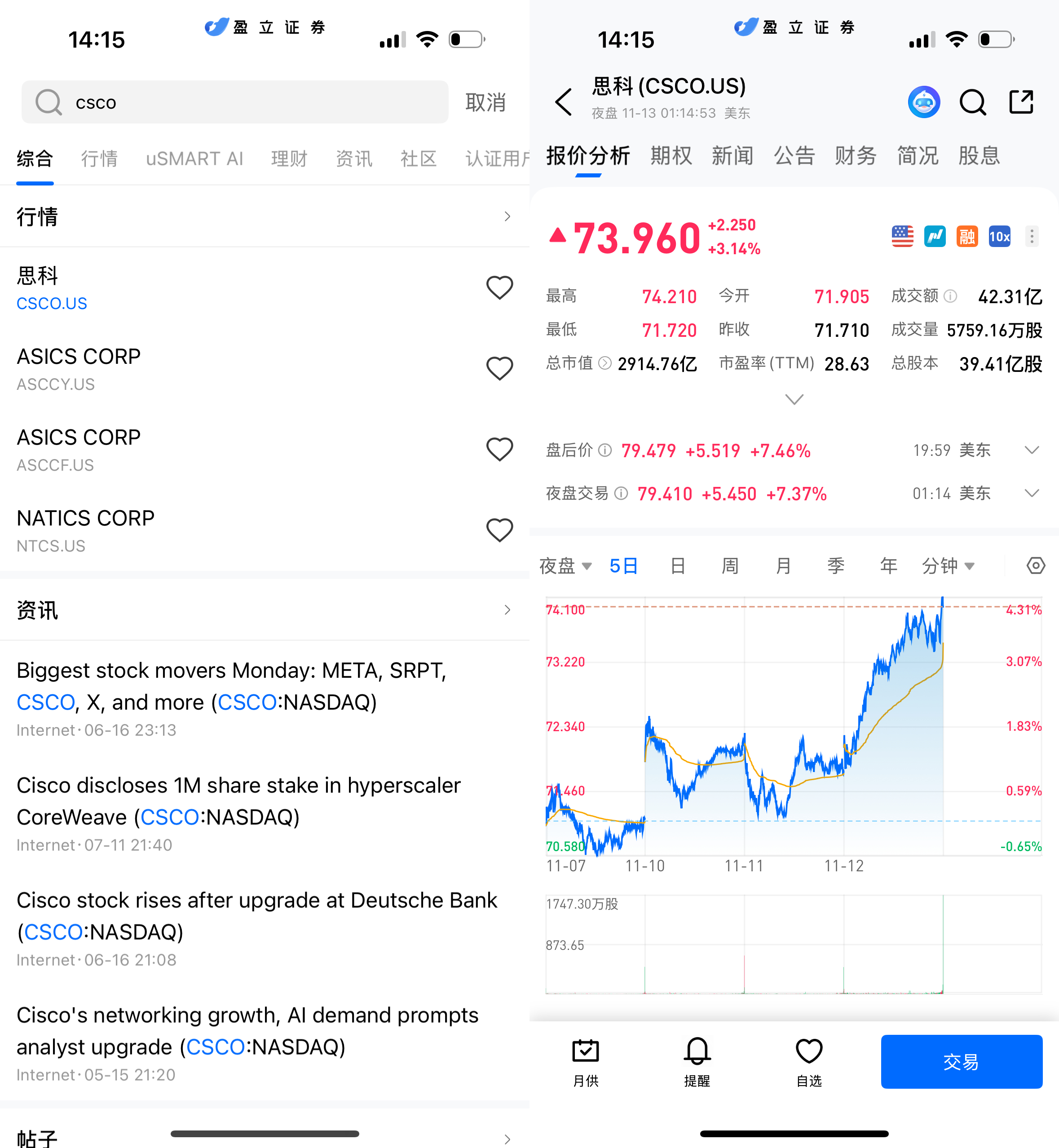 登入 uSMART HK APP 后,于页面最右上方点击「搜索」,输入标的代码(CSCO.US)并进入详情页,了解交易详情与历史走势。点击右下角「交易」,选择交易类型,最后填写交易条件后送出订单即可。
