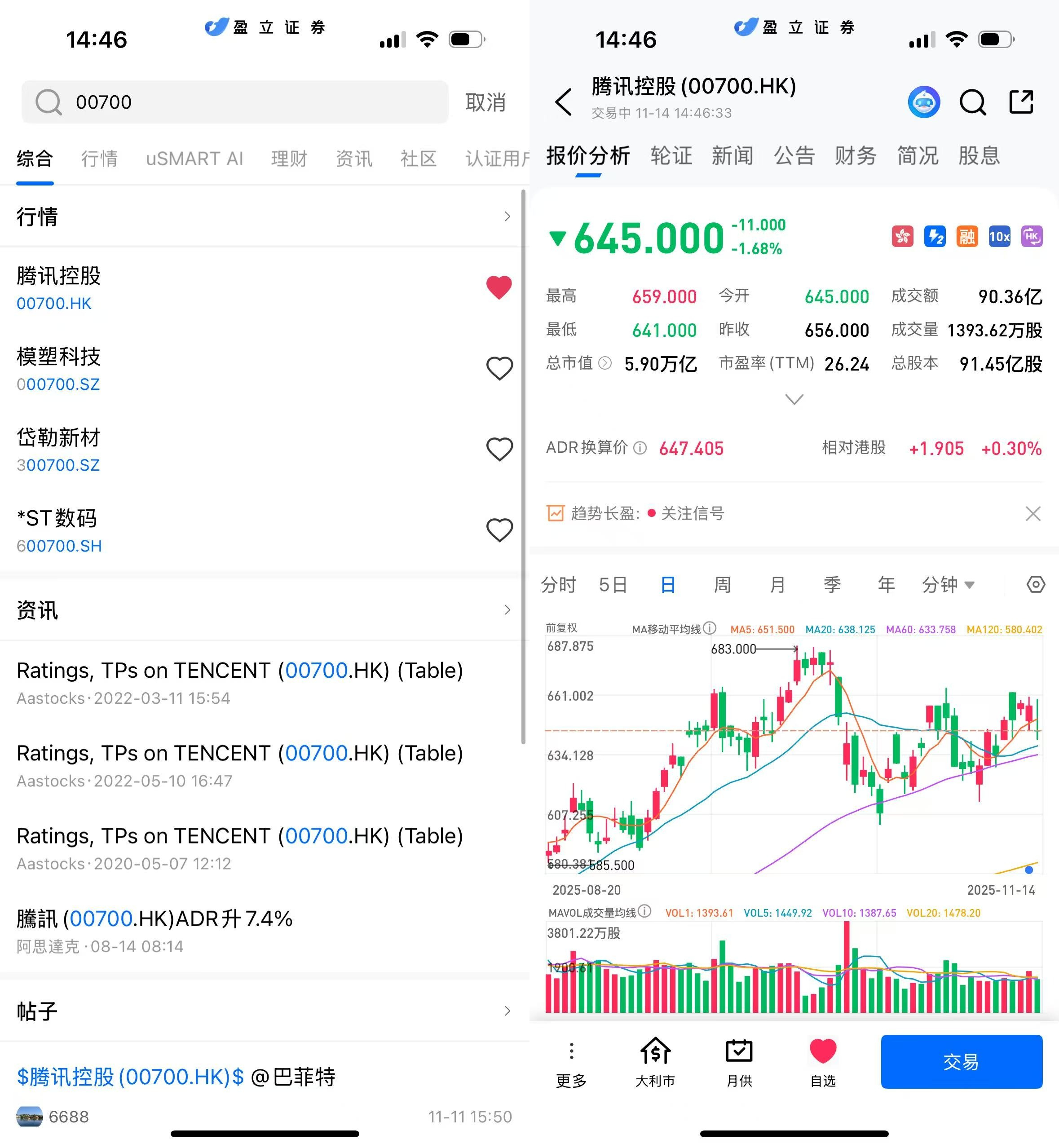 从日线走势来看,腾讯自今年5月下旬低点约489.6港元后持续反弹,累计升幅显著,并在11月初一度逼近683港元高位。随着财报超预期公布后,股价保持在60日与120日均线之上。