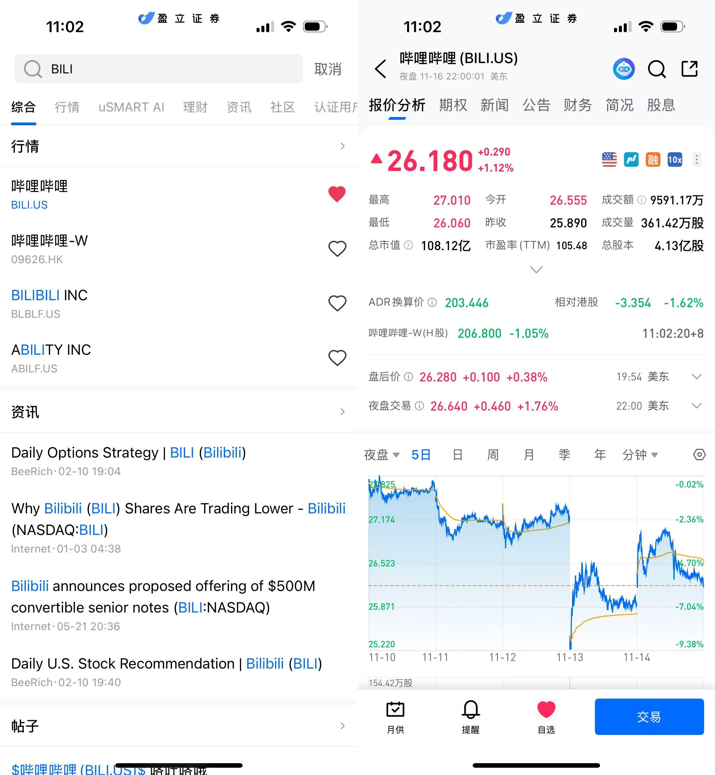 登入 uSMART HK APP 后,于页面最右上方点击「搜索」,输入标的代码(BILI.US)并进入详情页,了解交易详情与历史走势。点击右下角「交易」,选择交易类型,最后填写交易条件后送出订单即可。