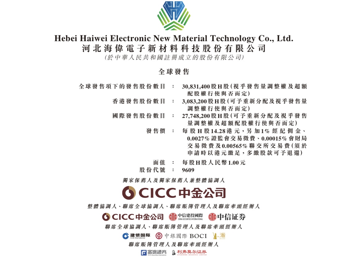 河北海伟电子新材料科技股份有限公司(Hebei Haiwei Electronic New Material Technology Co., Ltd., 9609.HK)启动香港IPO,招股期为11月20日至11月25日,拟全球发售30,831,400股H股,并设15%超额配股权;每股发售价14.28港元,每手200股,入场费约2,884.80港元;预期11月28日于联交所主板挂牌,中国国际金融香港证券有限公司为独家保荐人。