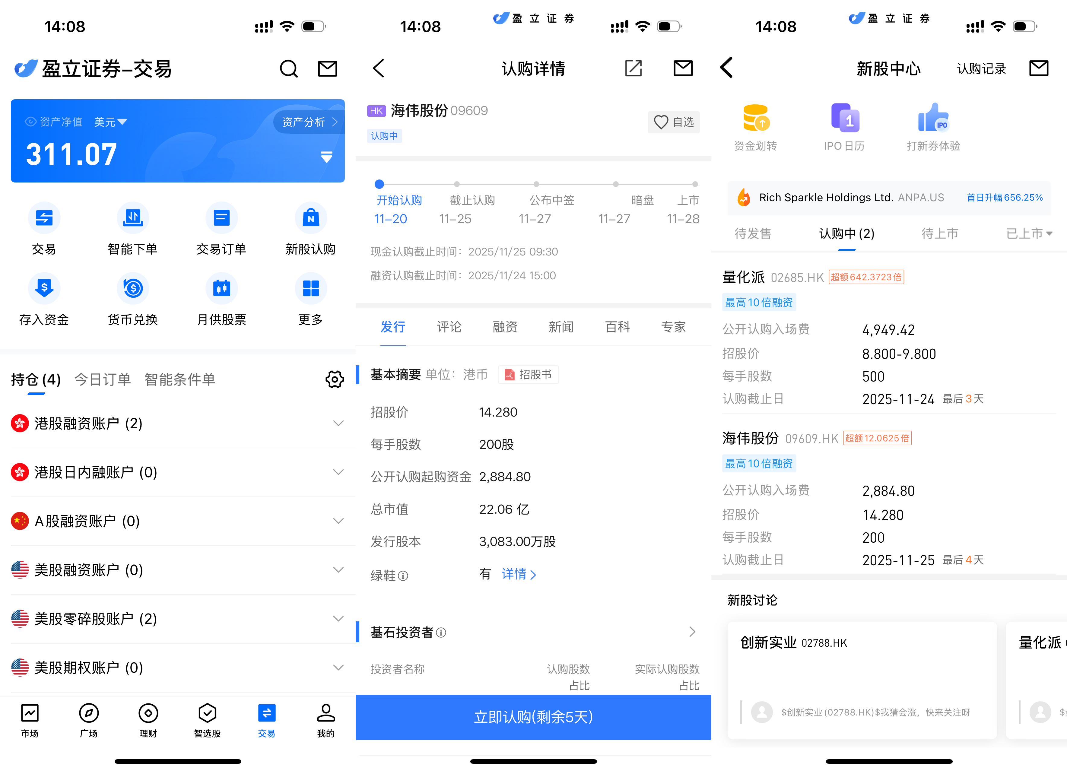 uSMART HK App 设有 IPO 中心,提供独家优惠,客户可在 App 即时认购公开发售之新股。登入 uSMART HK App 后,点选右下角「交易」,进入「新股认购」,选择海伟股份后点击「公开认购」,填写认购数量并提交订单即可。
