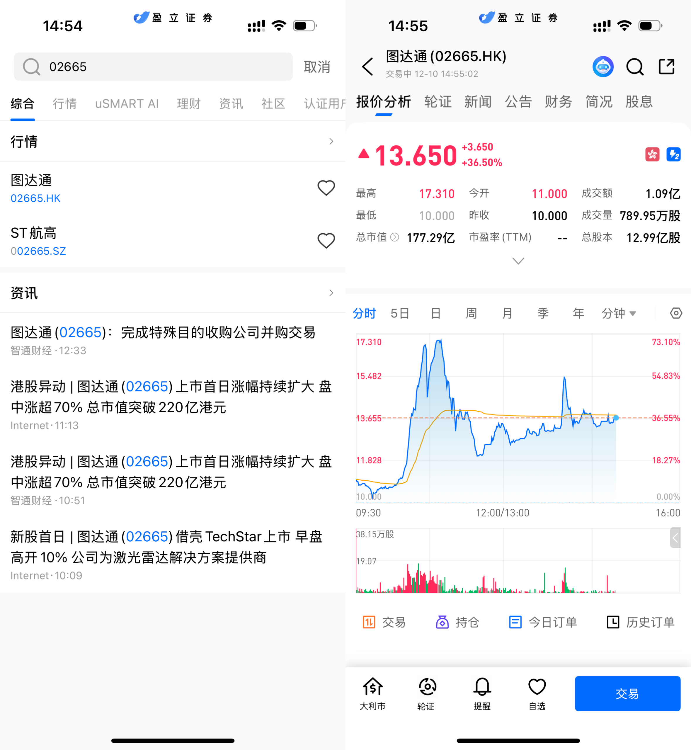 2025年12月10日,图达通(02665.HK)正式登陆港交所,首个交易日上午股价即强势拉升,成为全场焦点。截至 11 时 17 分,股价报 13.99 港元,较 10 港元的上市价上涨 39.9%。盘中一度涨至 17.31 港元,涨幅超过 70%,为今日港股市场表现最抢眼的新股之一。