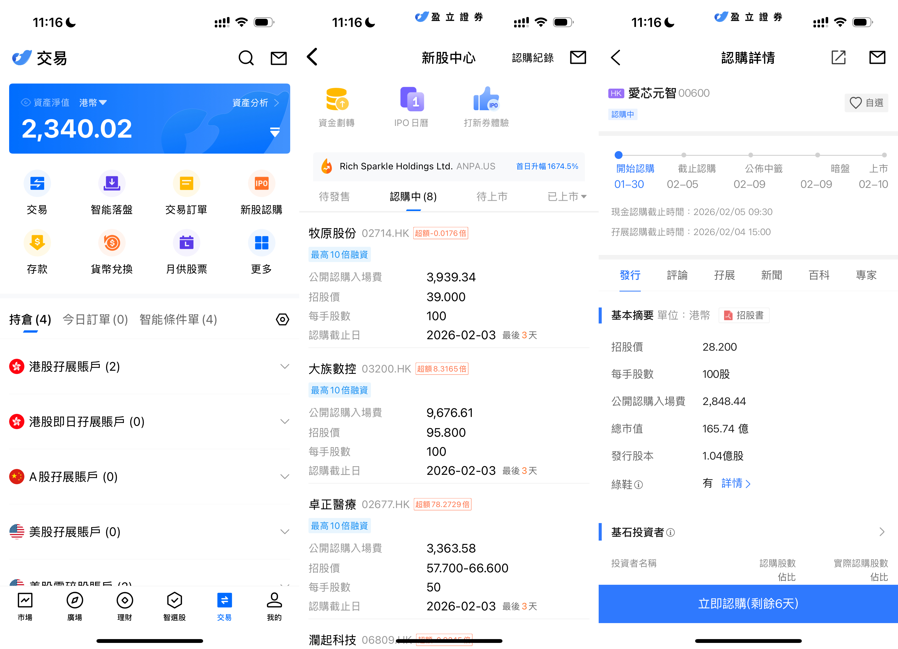 uSMART HK App 設有 IPO 中心,提供獨家優惠,客戶可在 App 即時認購公開發售之新股。登入 uSMART HK App 後,點選右下角「交易」,進入「新股認購」,選擇愛芯元智後點擊「公開認購」,填寫認購數量並提交訂單即可。