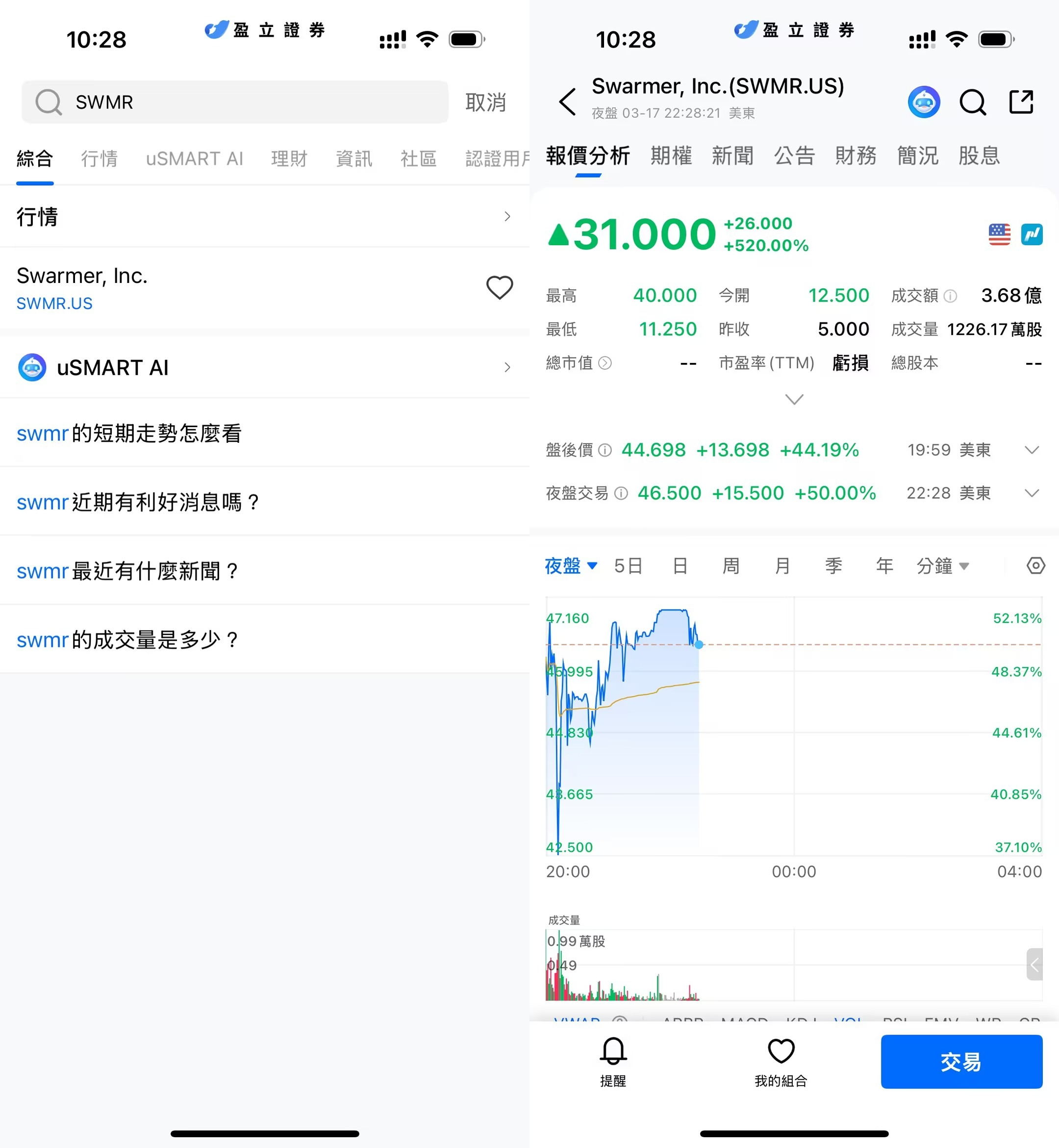 3月17日,美股市場迎來一只現象級新股,無人機軟體公司Swarmer(SWMR.US)一舉成為焦點。IPO定價僅為5美元,盤中一度沖高至約40美元,漲幅接近700%;儘管隨後有所回落,收盤仍報31美元,單日漲幅高達520%,對應公司市值約3.5億美元。