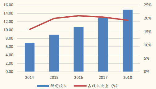 此外,用友转型云服务市场,需要硬核技术。我们看到用友网络确实也加大了研发投入力度。2018年,研发投入14.86亿元,占总营收比例高达19.29%,其中对云业务的投入比重达48.3%。