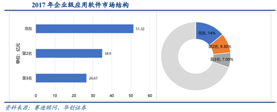 软件基本盘方面,用友网络还是比较稳的。用友在中国企业级应用(EA)软件市场、中国ERP软件市场、中国财务软件市场持续保持市占率第一的地位。并且,中国500强企业56%是用友客户。据赛迪顾问《2017-2018年中国企业级应用软件市场研究年度报告》显示,用友在企业级应用软件市场领域持续领跑,以51.32亿元人民币的营收,占据14%的市场份额,稳居第一。