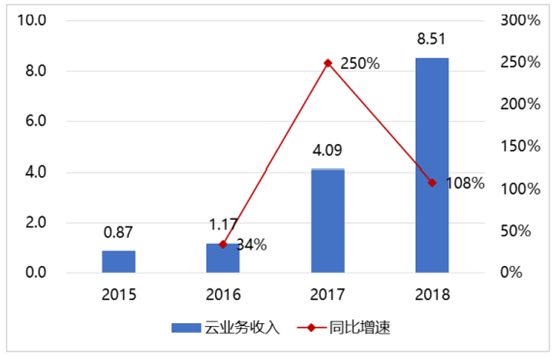 从云服务营收增长来看,2015年云服务业务实现8695万元收入,2016年突破亿元大关,2018年全年公司云服务业务实现收入8.51亿元,同比增长108%。