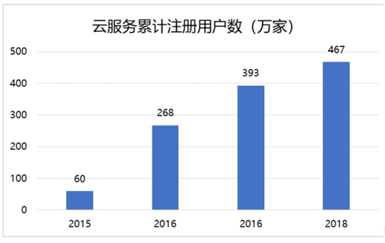 从用户数量来看,公司的云服务累计注册企业客户数已从2015年底的60万上升到2018年底的467万,其中累计付费企业客户数达36.19万家。截止今年一季度,云服务注册客户数达477万家,付费数达37.98万家,同比增长46.3%。