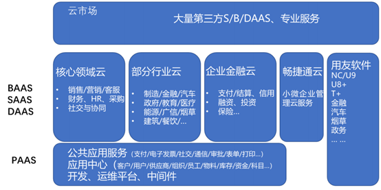 平台层面,用友推出中 台战略,以“业务中 台+数据中 台+技术中 台”助力企业数字化转型,前端应用场景组件化,能力沉淀至中 台统一处理、迭代,提供“SaaS+PaaS+DaaS+BaaS”多类型服务。