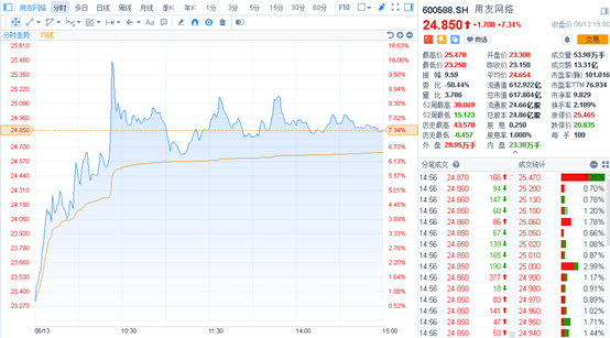 华为到用友产业园考察交流,用友网络今日盘中就曾一度摸到涨停板。截止收盘,股价暂报24.91元,涨幅高达7.6%,总市值为617.8亿元。