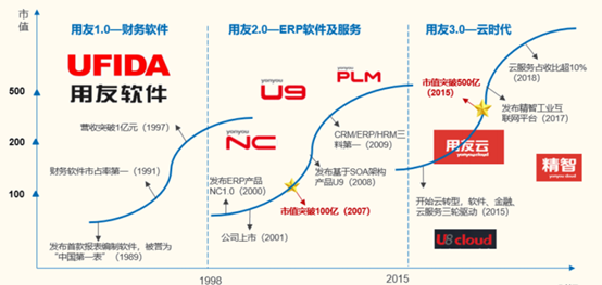 第二阶段,即1998—2015年,是ERP软件以及服务的年代。用友网络也于2001年正式挂牌上交所,于2007年突破100亿元市值大关。期间,先后发布CRM/ERP/HRM等新品,三大产品线于2009年取得了国内市占率第一的成绩。