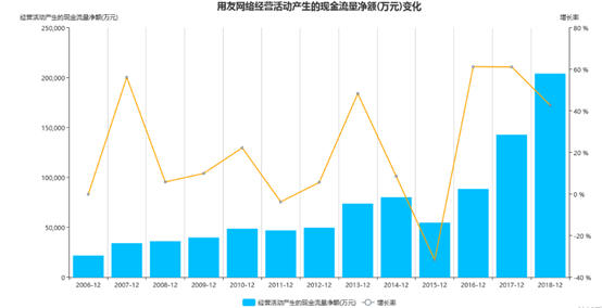 2018年,用友经营活动产生的现金流净额为20.43亿元,同比增长42.81%,2016年和2017年同比增速更是达到60%以上。这也说明公司近3年的增长非常迅猛,现金流净额与净利润增长保持同向,且前者增速大于后者,是一个好现象。