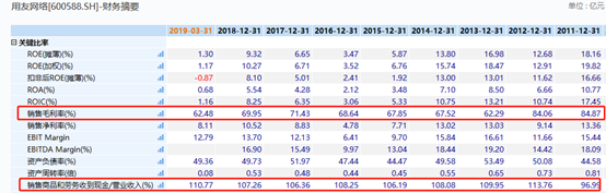 另外,我们再来观察下用友财报的其他几个指标,一个是毛利率,一个是“销售商品和劳务收到现金/营业收入”。