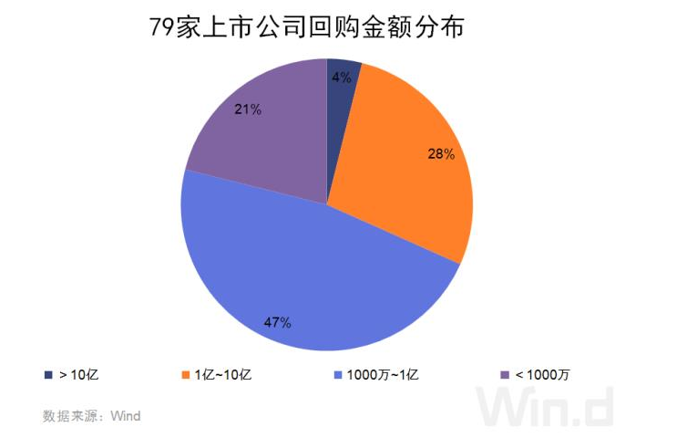 回购状态处于“实施”状态的上市公司中,有7家上市公司已回购超10亿元A股;50家上市公司已回购金额介于1亿元和10亿元之间。此外,37家上市公司实施回购金额小于1000万元。