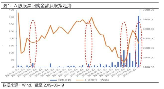自2018年11月A股回购规模松绑以来,上市公司股票回购规模持续扩大,在2019年1月创新高达到117.58亿元。与此相对,上证指数在1月2440.91处见底,随后开启春季行情。