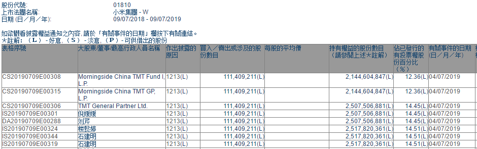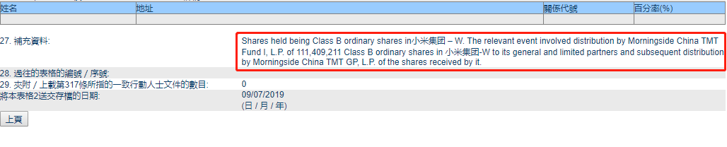 格隆汇获悉,根据港交所最新权益披露资料显示,小米集团-W(01810.HK)主要股东晨兴资本(Morningside)于7月4日向基金各GP及LP配发小米集团合计约1.11亿股B类股份或0.64%股份,此次配股可视为各GP及LP将其在基金权益兑换为小米集团的股票。