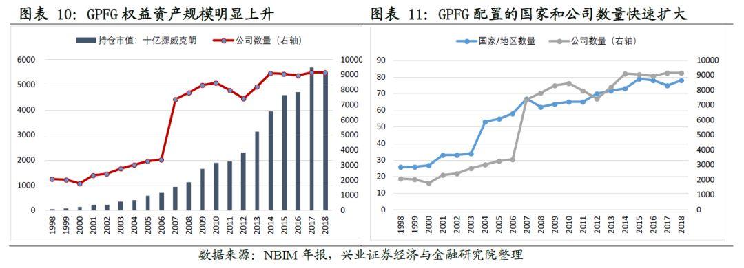截止2019年3月末,GPFG总资产市值8.94万亿挪威克朗,约1.04万亿美元,是世界上最大的主权财富基金。自1998年NBIM成立并正式管理,GPFG已产生4.4万亿克朗投资收益,超过挪威政府的财政转移拨款3.38万亿克朗。根据数据显示,GPFG的规模变化来自于三个方面:1)投资损益。98年至今投资收益为负的情况出现过5次,其中2008年金融危机期间,基金亏损超6000亿克朗,2018年亏损4850亿克朗,是20年中亏损最严重的两次。2)财政拨款或支取。GPFG可用于财政开支,但比例不得超过规模的4%(短期可能存在弹性),但除了2016和2017年以外,挪威政府的财政拨款持续对GPFG带来资金注入,是基金的规模快速上升的主要来源。3)汇兑损益。GPFG全部投资于海外,目前共投资了73个国家9158家公司,涉及数十种货币,因此汇率变化对基金的规模也产生了较大影响,例如2018年挪威克朗的走弱为GPFG带来了2240亿克朗的正贡献。