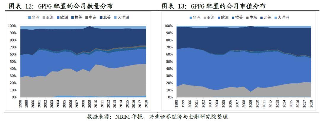 具体来看权益资产配置情况,我们整理了1998年至2018年这20年间GPFG的持仓,随着基金规模的扩大,权益资产规模扩大了近80倍,投资范围从1998年的26个国家及地区扩散至目前的78个,投资的公司数量也从1998年的2100家上升至目前将的近9200家。NBIM更偏好亚洲、北美和欧洲三大区域的企业,但对北美和欧洲的投资比较集中,亚洲地区的投资更为分散。2012年前后,NBIM开始进军非洲和中东市场,目前对非洲地区的配置主要集中在埃及和南非,中东地区主要集中在以色列。