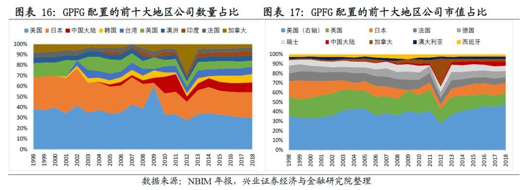 截止2018年12月,GPFG的资产覆盖全球73个国家和9158家公司,主要集中在北美、欧洲,占比高达74.1%。对于亚洲和大洋洲资产配置占比为19.3%;对于新兴市场资产配置占比为10.3%。从具体国家及地区来看,尽管GPFG投资的地域范围非常广泛,但持仓规模前十的地区(见下图)占到总规模的80%以上,70%以上的公司都处于这10大地区,集中度非常高。值得注意的是,自2003年NBIM首次配置中国大陆市场起,中国大陆区的持仓出现快速上升,目前规模排名第七,企业数量排名第三,也是新兴市场中唯一双双进入前十的地区,后续NBIM或将继续扩大对中国内地市场的投资。