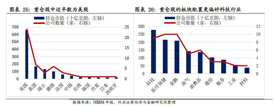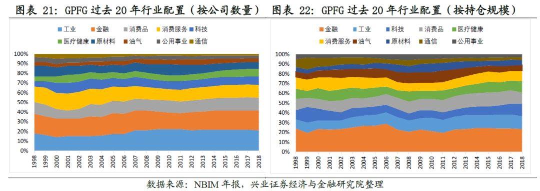 我们将时间拉长至20年视角,NBIM对整体板块配置并未出现较大波动,金融和工业始终是重点关注的领域,对于科技、医疗健康以及消费服务这一类新兴产业的配置规模有所上升,而油气、通信以及原材料等传统行业配比略有下降。
