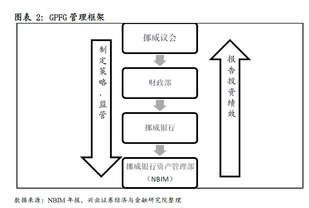 财政部为受托机构,NBIM为执行机构。GPFG在成立初期由挪威财政部直接负责管理,主要投资于政府担保债券等低风险固定收益类产品,风格非常保守。1998年,挪威议会批准成立NBIM(Norges Bank Investment Management),财政部作为受托机构制定投资决策,将GPFG资产配置比例调整为60%的股权和40%的债权,NBIM作为执行机构,根据财政部的投资策略执行基金管理的具体业务,至此GPFG的管理框架初具雏形。